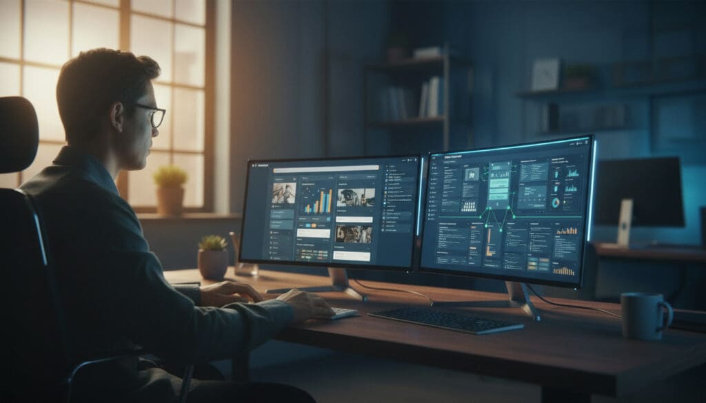 Widescreen monitor showing fluid multi‑column grid layouts reflowing for different devices, symbolizing next‑generation responsive grid systems.
